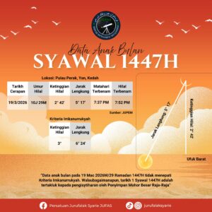 - Persatuan Jurufalak Syarie (JUFAS) mengucapkan selamat menunaikan fardu kifayah kepada semua Ahli Jawatankuasa Rukyah Negeri dan pihak terlibat dalam cerapan anak bulan Syawal 1447H. Semoga segala usaha dan pengorbanan anda semua dibalas dengan sebaik-baik ganjaran daripada Allah SWT.